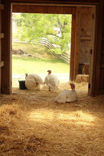 The turkeys were mesmerizing with all their trilled vocalizations. They can be very curious and affectionate and some of them love cuddling on one's lap. Turkeys are also bred to be unnaturally big with abnormally large breasts. As a result, they are too big to mate with each other. The males can crush the females to death with the effort. All the turkeys are bred to be white to make their flesh lighter and thus more pleasing to consumers. Here is more information from Farm Sanctuary on how turkeys are raised in factory farms.